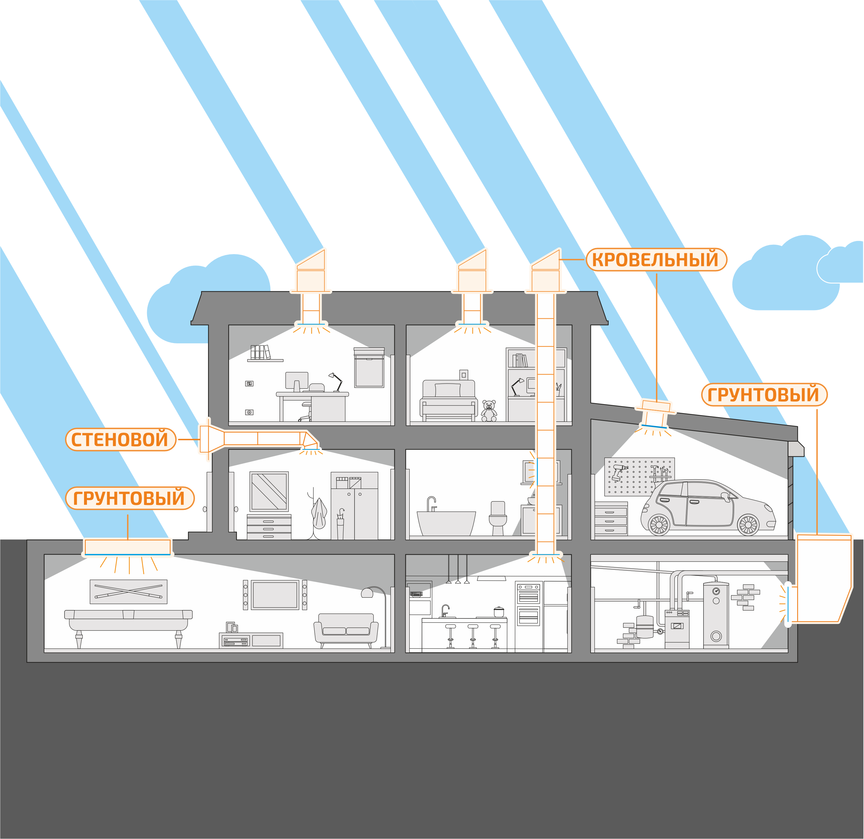 Встраиваемый световод в стену. Тоннель дневного света имеет круглое и квадратное светоприемное устье